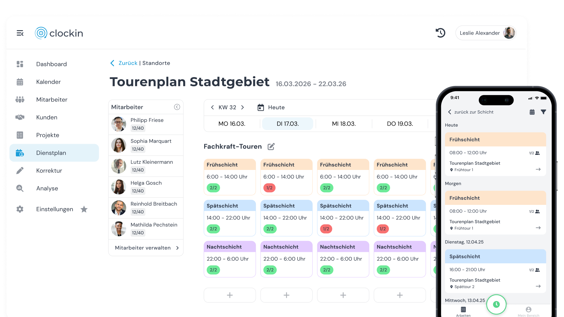 Ja, deine Mitarbeiter sehen ihre Dienste direkt in der clockin-App – jederzeit und von überall. Auch nach der Veröffentlichung kannst du den Plan anpassen. Änderungen werden sofort übernommen und dein Team wird automatisch in der App benachrichtigt.